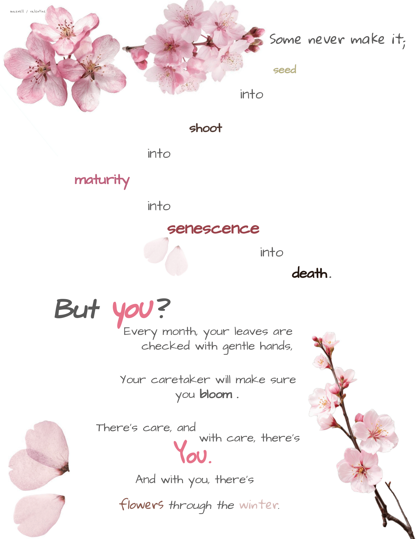 A good plant owner will always support every stage the plant moves through; from sapling to fruit production, special fertilizer to pruning leaves. Every part of a plant's transition is every part of one's own transition, and blooming is what comes with finding a full self and welcoming the acceptance that comes with it. This piece directly links plant care to transition care, treating a body as not just human but part of the Earth it resides on.